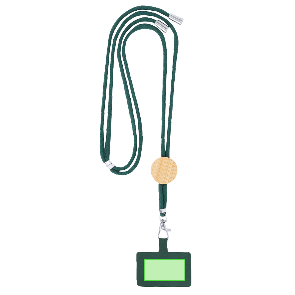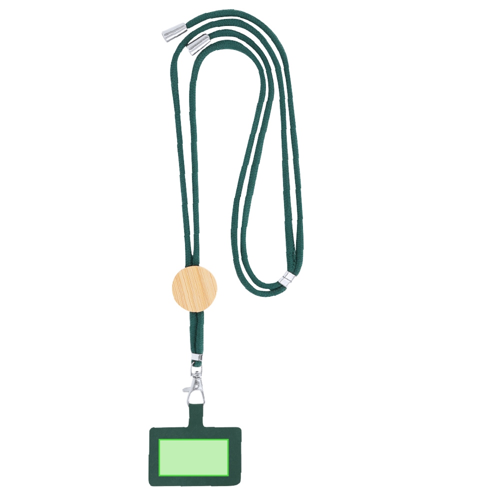 Lanyard mit Smartphone-Zubehör. Hergestellt aus strapazierfähiger Baumwolle mit Bambuselement. Enthält ein Transportzubehör, das zwischen Hülle und Smartphone platziert wird, sowie einen drehbaren Metallkarabiner. Versteller am Nacken mit verchromten Details an den Kordelenden. Materialien wie Bambus fördern die Verwendung natürlicher Rohstoffe und reduzieren Schadstoffemissionen. Er stammt von einer sehr widerstandsfähigen und vielseitigen Pflanze mit schnellem Wachstum und Regeneration und ist damit eine ausgezeichnete Alternative zu herkömmlichem Holz.