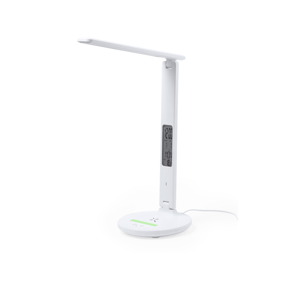 All-in-one-Multifunktions-Klappleuchte aus widerstandsfähigem weißem ABS mit Kunstlederoberfläche. Ausgestattet mit 60 LEDs und 3 Beleuchtungspositionen (warm, kalt und mittel), mit einstellbarer Lichtintensität über die Berührungstaste an der Basis. Ausziehbar und leicht zu positionieren, mit integriertem und hinterleuchtetem LCD-Display, das Uhrzeit, Datum, Tag und Temperatur anzeigt. Mit Einstelltasten auf der Rückseite und Knopfbatterie zur Datenspeicherung.Enthält ein in die Basis integriertes kabelloses 10-W-Ladegerät mit Typ-C-Eingang, das mit kabellos aufladbaren Mobilgeräten kompatibel ist. Mit Typ-C-Ladekabel und Bedienungsanleitung in Englisch und Spanisch. Präsentiert in einer attraktiven Kraft-Design-Box.