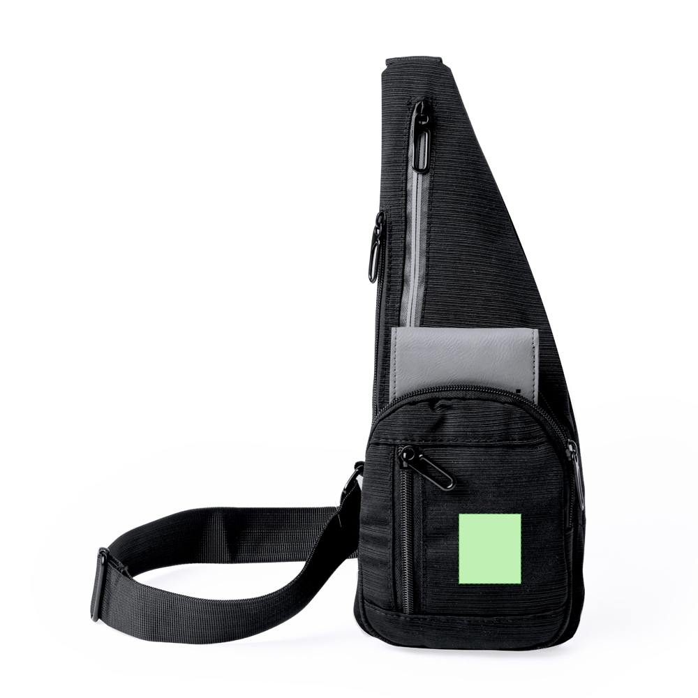 Diese Umhängetasche aus 300D-Polyester bietet mehrere Taschen für eine effektive Organisation. Auf der Vorderseite und an der Seite befinden sich zwei Haupttaschen sowie zwei zusätzliche Taschen auf der Vorder- und Rückseite. Für bessere Sichtbarkeit sorgt ein reflektierender Streifen an der Mitteltasche. Einzeln in einer recycelten Tasche präsentiert.