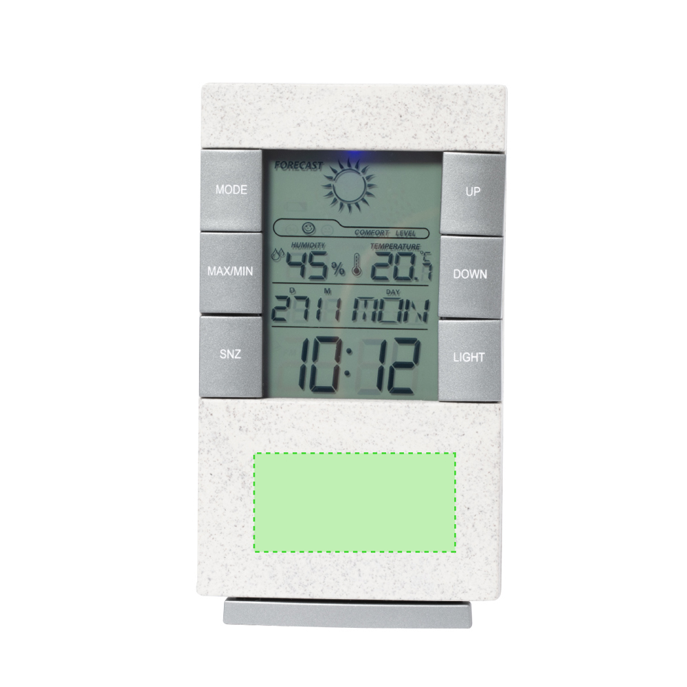 Wetterstation aus Weizenstroh, mit Thermometer und Hygrometer. Zeit-, Kalender-, Alarm- und Wochentagsfunktionen, gut ablesbar auf dem hintergrundbeleuchteten Display. Mit Sockel/Halterung und Haken zum Aufhängen. Batteriebetrieben (2xAAA, nicht im Lieferumfang enthalten) und in einer attraktiven Kraft-Design-Box präsentiert. Gebrauchsanweisung in Englisch und Spanisch.Weizenstroh fördert die Verwendung natürlicher Rohstoffe und reduziert so die Schadstoffemissionen.